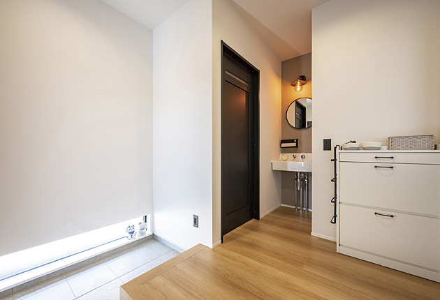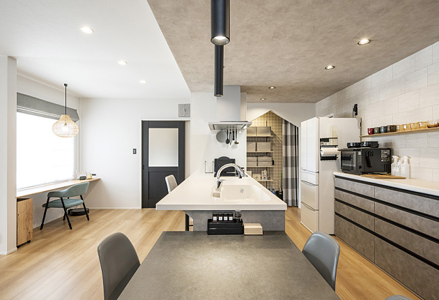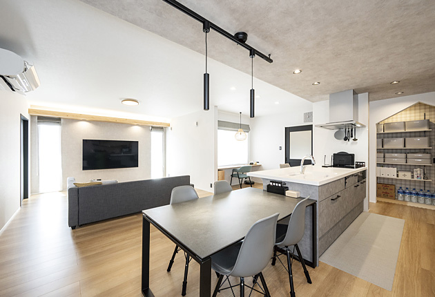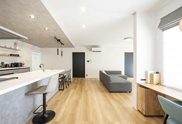 とにかく自分が動きやすいように導線にはこだわりました。アパートで経験した使い辛い部分を考え形にしました。廊下を無くし、リビングを広くし、子供を見守りながら家事がこなせるよう工夫しました。その分、収納をどのくらい削るかも考えました。この家に住んで2年になりますが収納で困った事は今のところありません。水回りを固めた事でQOL(生活の質)は爆上がりしましたね。扉は引き戸にする事で開けっ放しでも違和感を無くす事が出来ます。意識して閉めたい時に閉めれば良いのですから。照明やキッチン1つ1つにも拘り、夫婦でショールームなど見学に回りました。テレビの上の間接照明もとても気に入っています。内装のクロスもサンプルを取り寄せ、アパートの壁に何度も貼って比べてみたりしました。